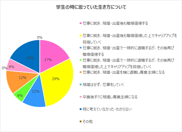 全体的に大きな差はないものの、「仕事に就き、結婚・出産後も職場復帰した上でキャリアアップを目指していく」が一番多い様でした。