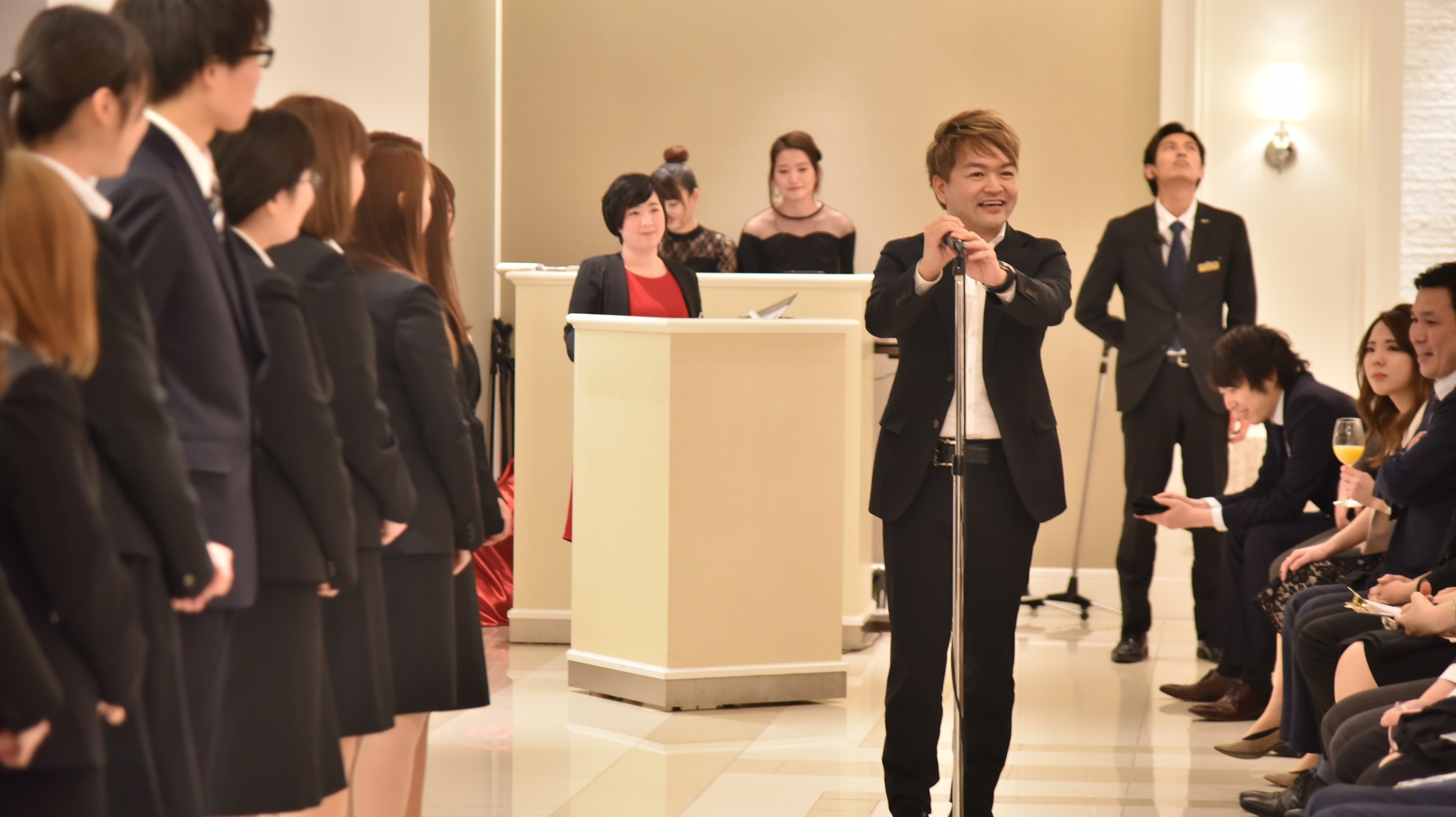 青木社長より新卒社員へバッジ、辞令書の授与が行われました!