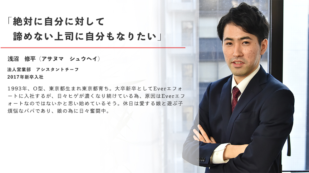 武蔵大学に通っており、在学中はアルバイトとしてカラオケの店員や、レンタルショップなどで働いていました。就職活動中にEverエフォートの会社説明会に参加し、説明会の時点で社長が出てきて話をしてくれたことがとても印象的で…社長との距離の近さにとても魅力を感じましたね。あと、面接では社長以外の幹部陣と話す機会もたくさんあって、それぞれ皆さんの話がとても面白く、「この人たちと仕事がしたい」と思い入社を決めました。
