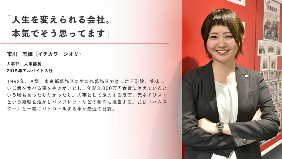 けど、就職活動中に当時の上司にご飯に誘われて行った先に、なんと社長まで来てくれて色々話をしてくれました。すごくびっくりしたのを覚えてます。そこで今考えている事を伝えたら「じゃぁ人事の仕事やってみれば?やってみて、ダメだったら辞めればいいよ。」とすごく軽い感じで言われて。その場ではそんな感じで良いの!?と衝撃を受けましたが、今考えると私の性格を考えて、背中をポンっと押してくれたんだなと思います。